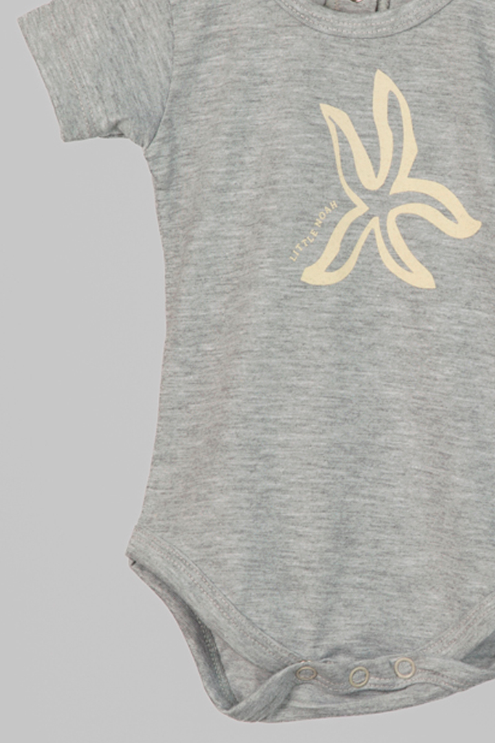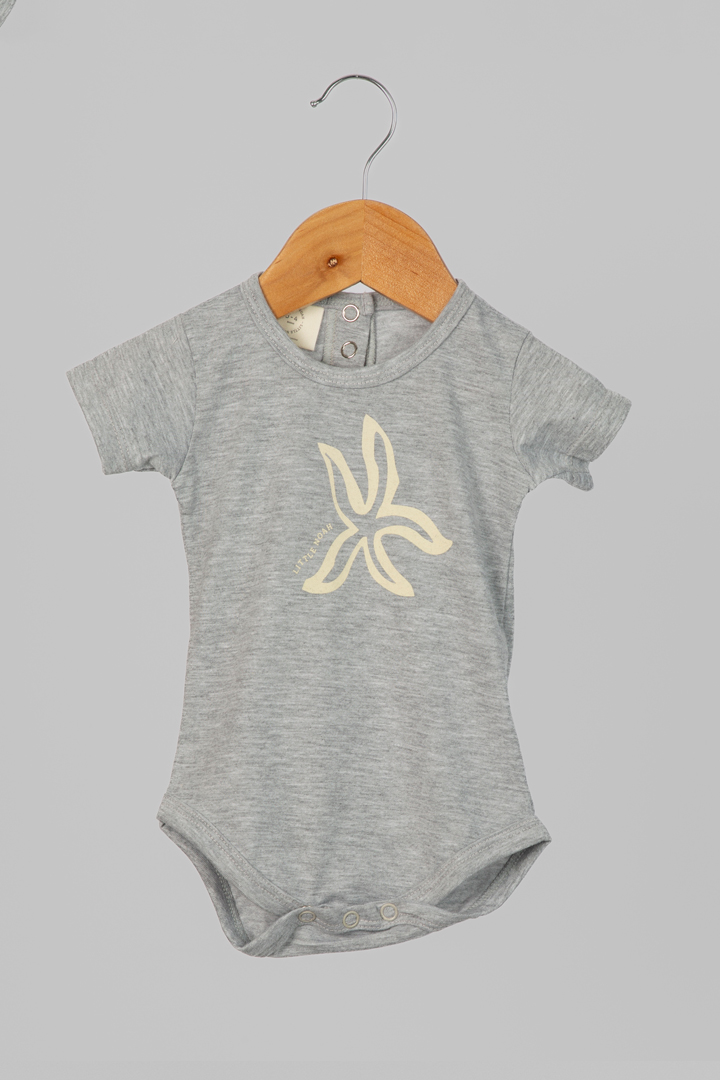 BODY GRIS STARFISH, con cuello americano para cómodo acceso y 3 broches pañaleros, este body combina estilo y funcionalidad.
