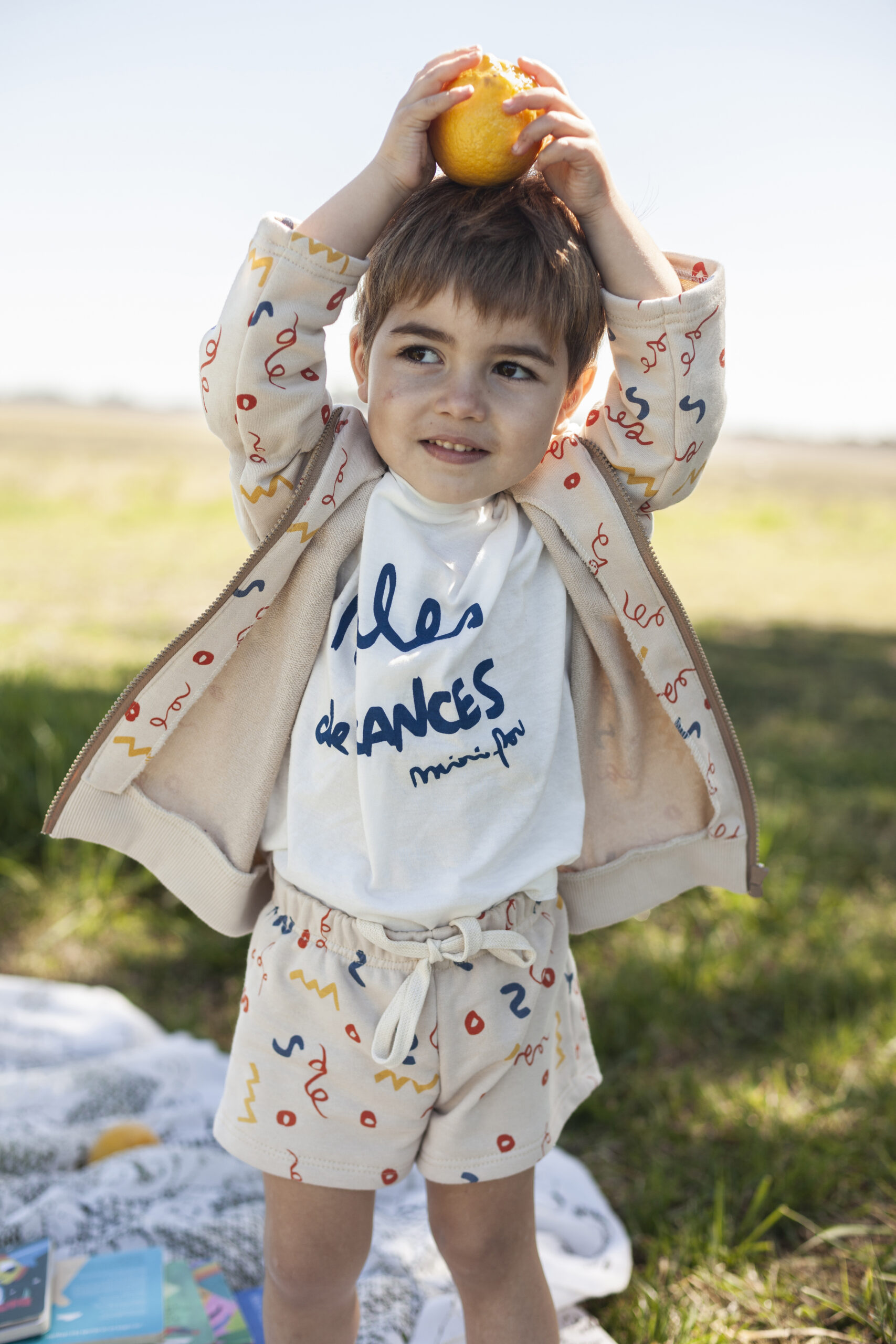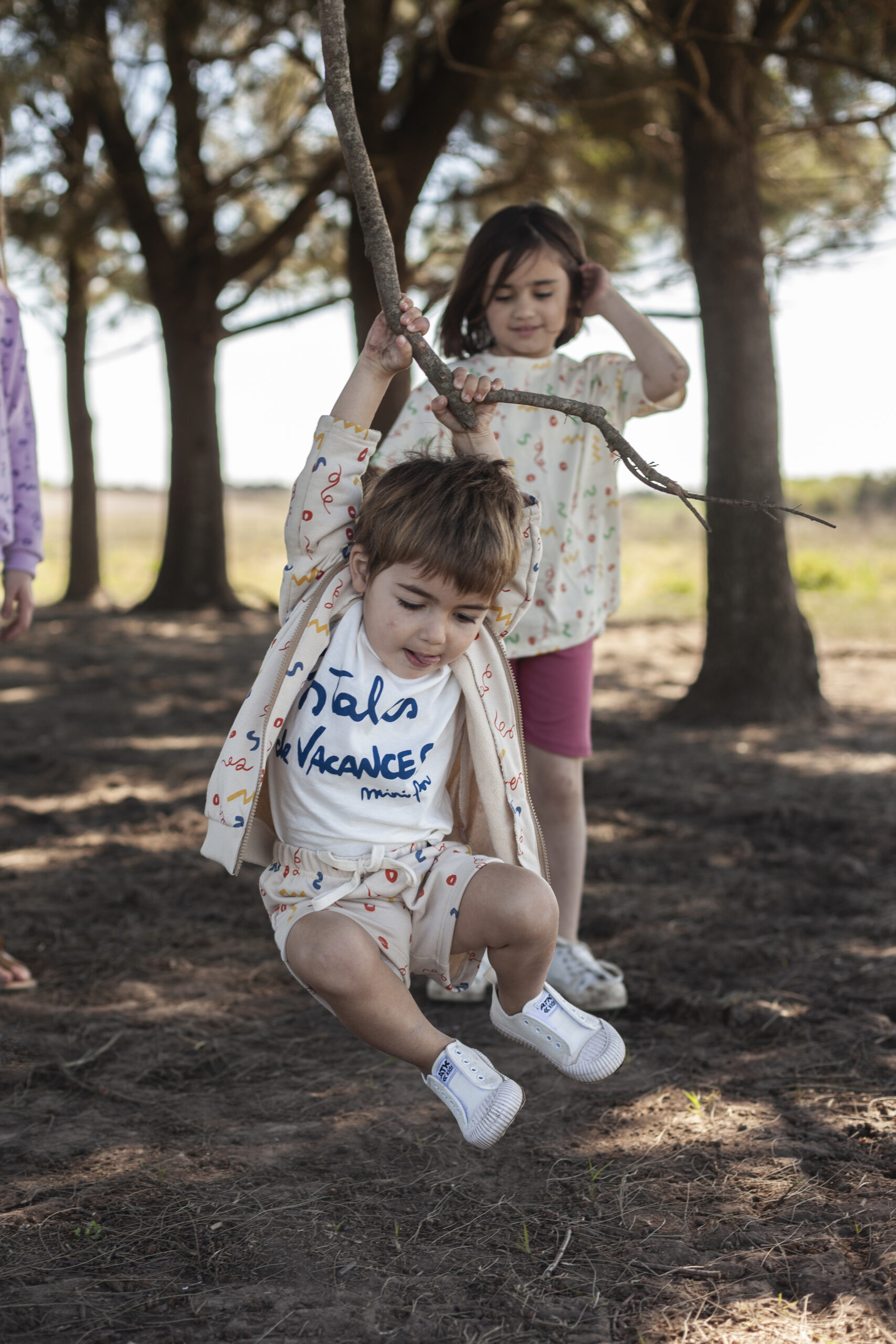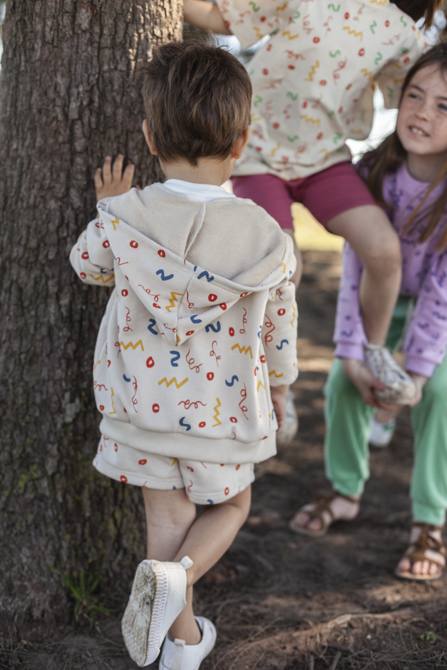 Campera confeccionada en rústico de algodón, con estampa continua realizada en serigrafía con tintas al agua (aptas para el uso de bebés y niños).