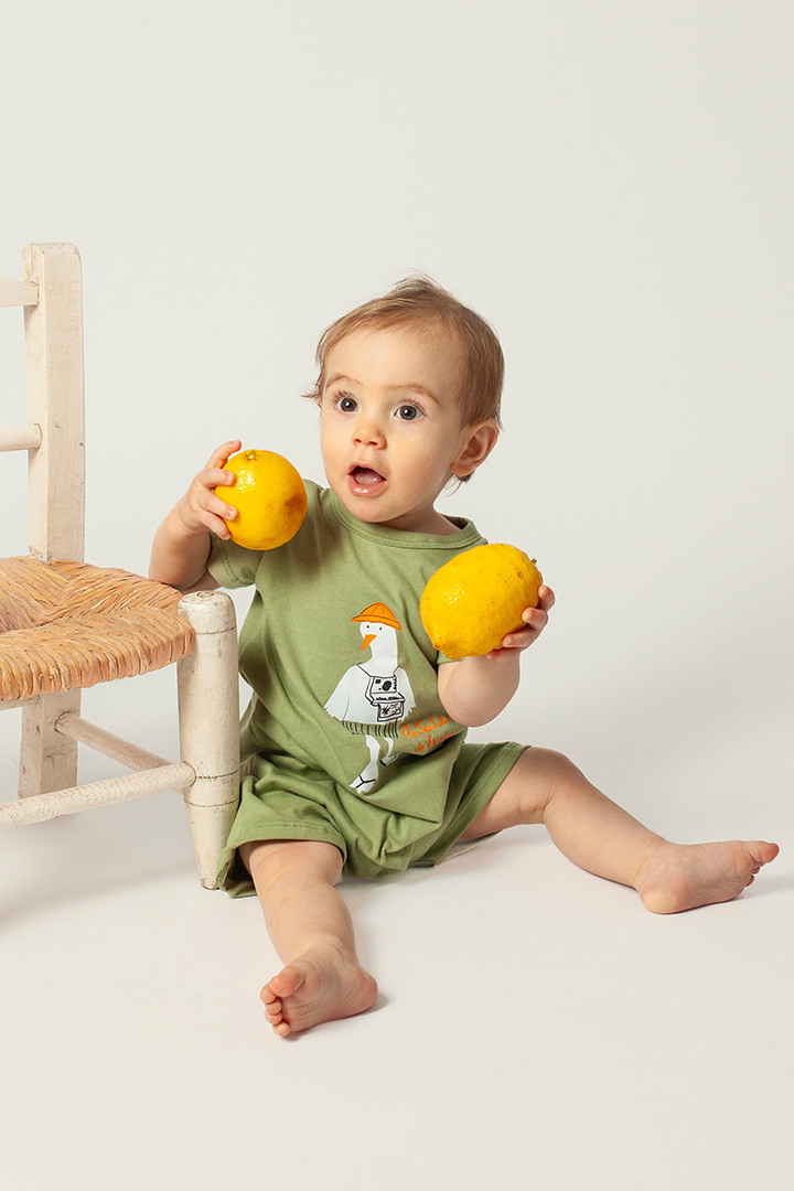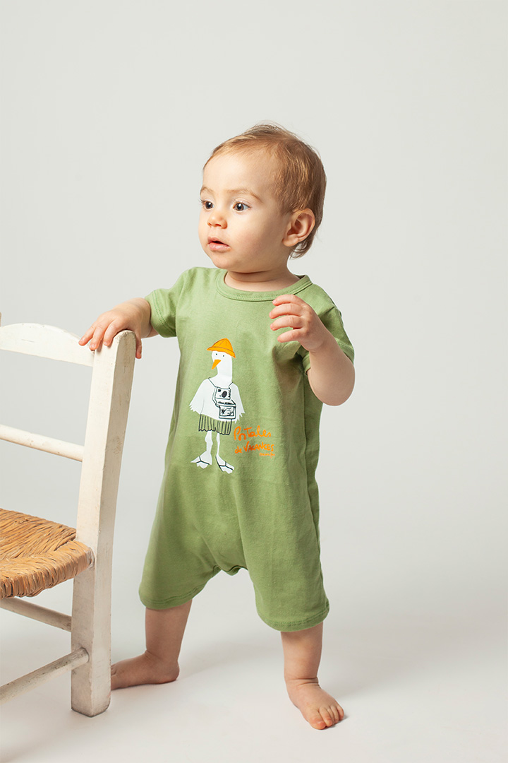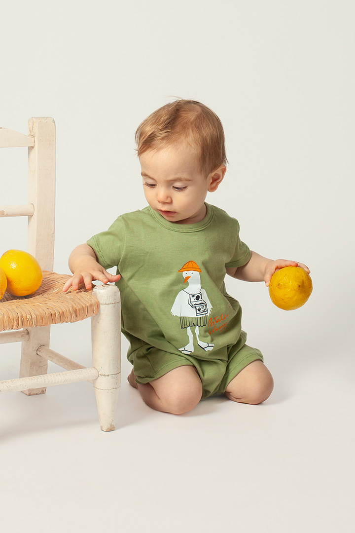 Enterito manga corta confeccionado en jersey de algodón, con estampa central realizada en serigrafía con tintas al agua (aptas para el uso de bebés y niños). Cuenta con broches pañaleros en la entrepierna para facilitar el uso y botones en la espalda para un acceso cómodo. Disponible del talle 0/3 al 12/18 meses.